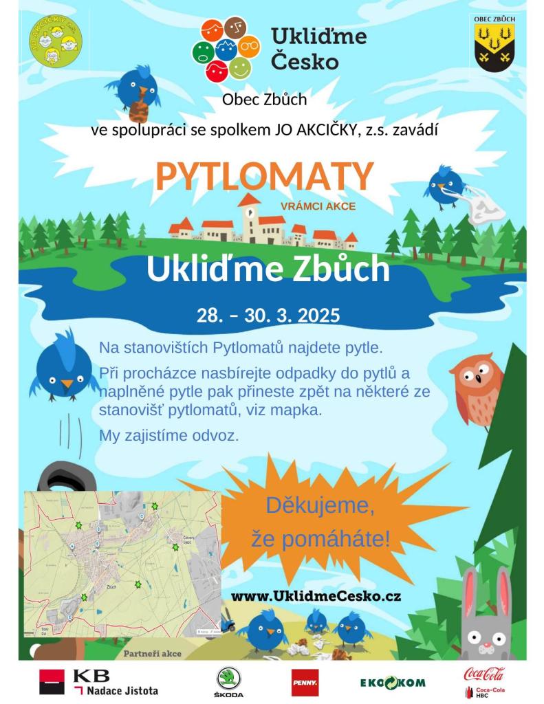 POMOZTE NÁM UKLIDIT ZBŮCH! Můžete tak učinit buď v pátek 28. března odpoledne v rámci organizované akce, nebo po celý víkend 28. - 30. 3. při vašich soukromých procházkách... Jak? Na stanovištích Pytlomatů najdete pytle. Sesbírané odpadky odkládejte do těchto pytlů, které po naplnění odneste na některé ze stanovišť Pytlomatů - viz mapka. My zajistíme jejich odvoz. Děkujeme, že pomáháte!